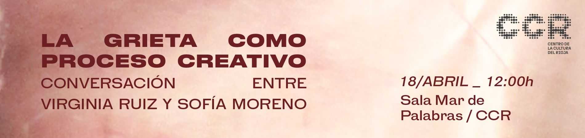La exposición “Creciendo entre grietas” de Sofía Moreno incorpora la actividad “La grieta como proceso creativo”, una conversación entre la propia artista y la escritora Virginia Ruiz en la sala Mar de Palabras. La sesión incluye la grabación de una audioguía en directo. Ruiz, autora del libro Lo que crece en las grietas, dialoga con Moreno en torno a una línea temática compartida: las grietas como lugares donde aún es posible la regeneración.